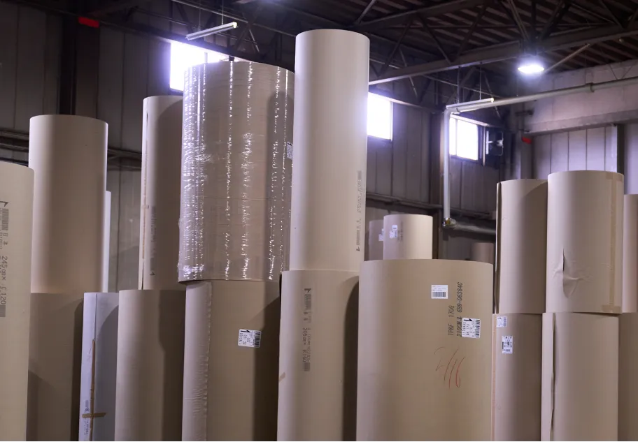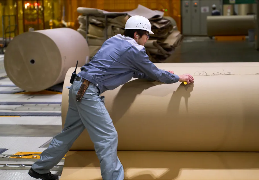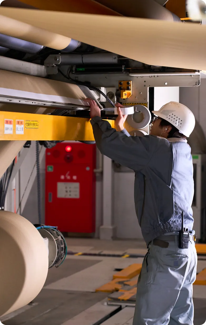 貼合では、長さ4,000m~6,000mほどある段ボール原紙を機械にセッティングします。全長100mほどあるコルゲートマシンの内部で高速で走らせながら波型の段を形成し、貼り合わせていきます。そして『紙継ぎ』と呼ばれる原紙のオーダーチェンジによって次の使用原紙に切り替え、連続生産を行います。