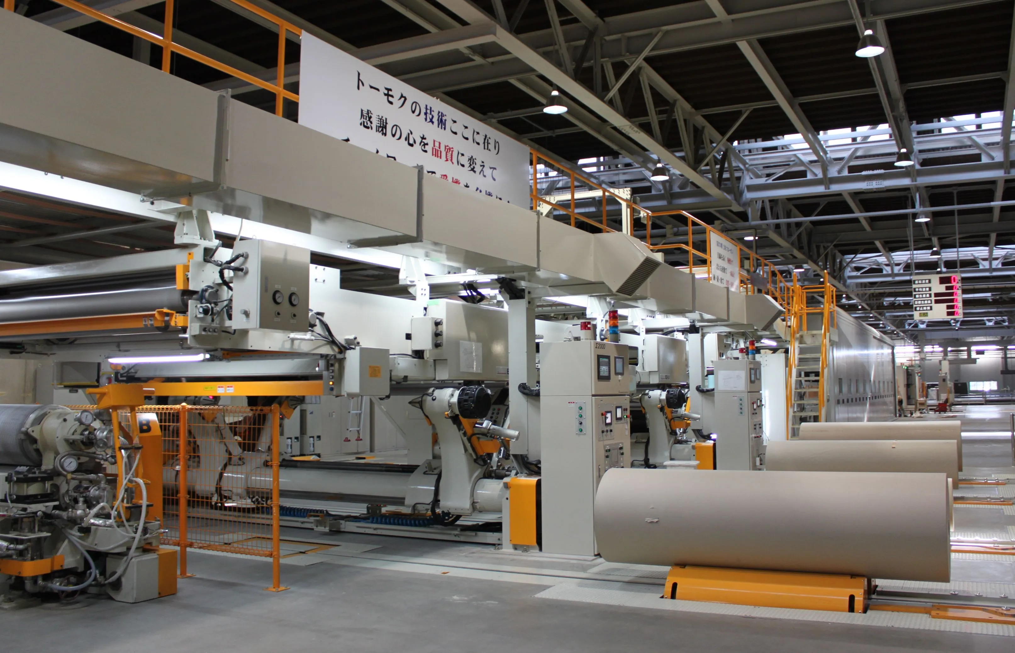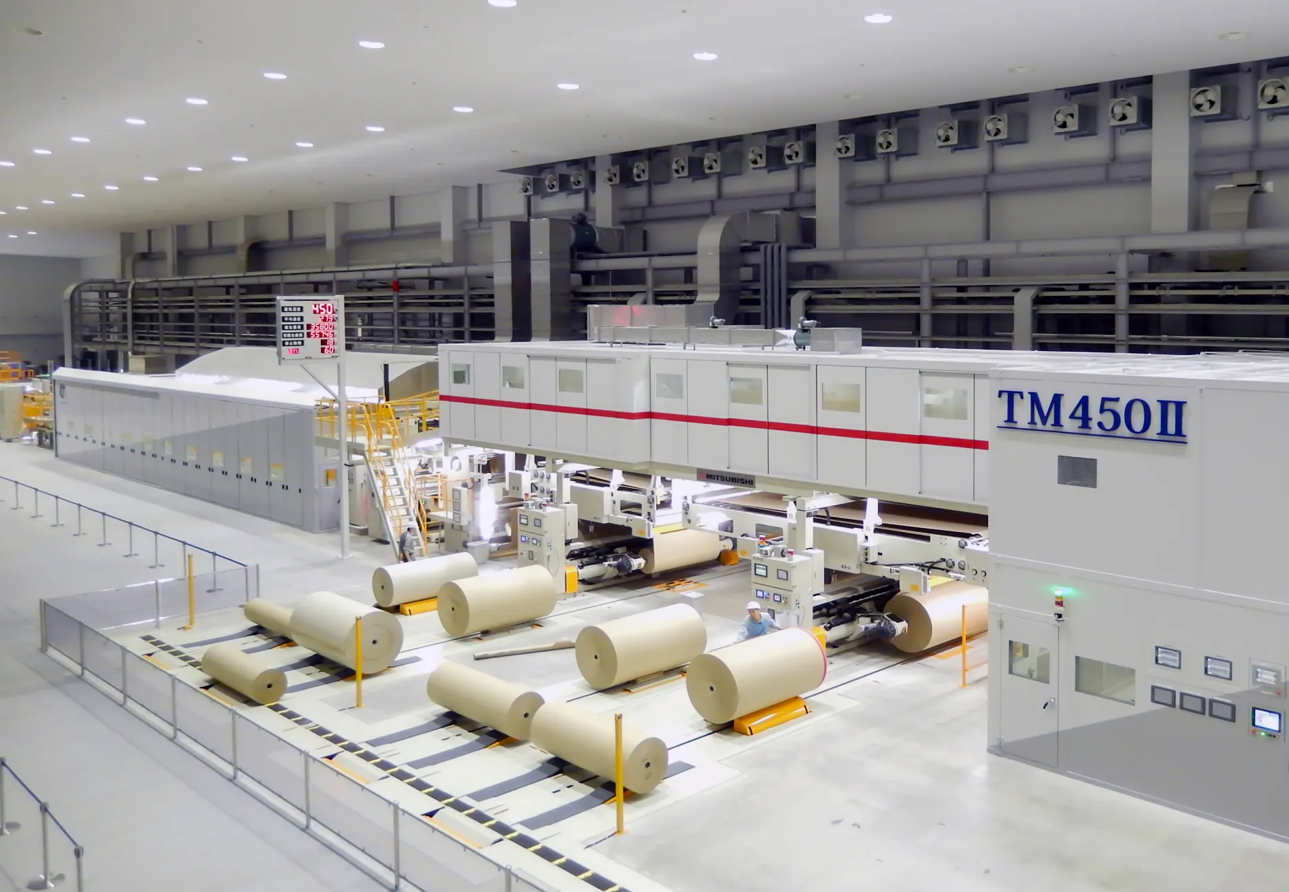 段ボール製造において3枚の段ボール原紙の貼り合わせ(貼合)を行うのが『コルゲートマシン』。トーモクの館林工場、神戸工場では貼合速度毎分450mという世界最速のスピードを持つコルゲートマシン『TM450』が稼働しています。トーモクが持てる技術力・ノウハウを盛り込み三菱重工機械システム(株)と共同で創り上げた世界最速の機械です。従来の世界最速記録である400mを50mも上回りました。この50mは業界では「次元が違う難易度の高さ」と言われています。
