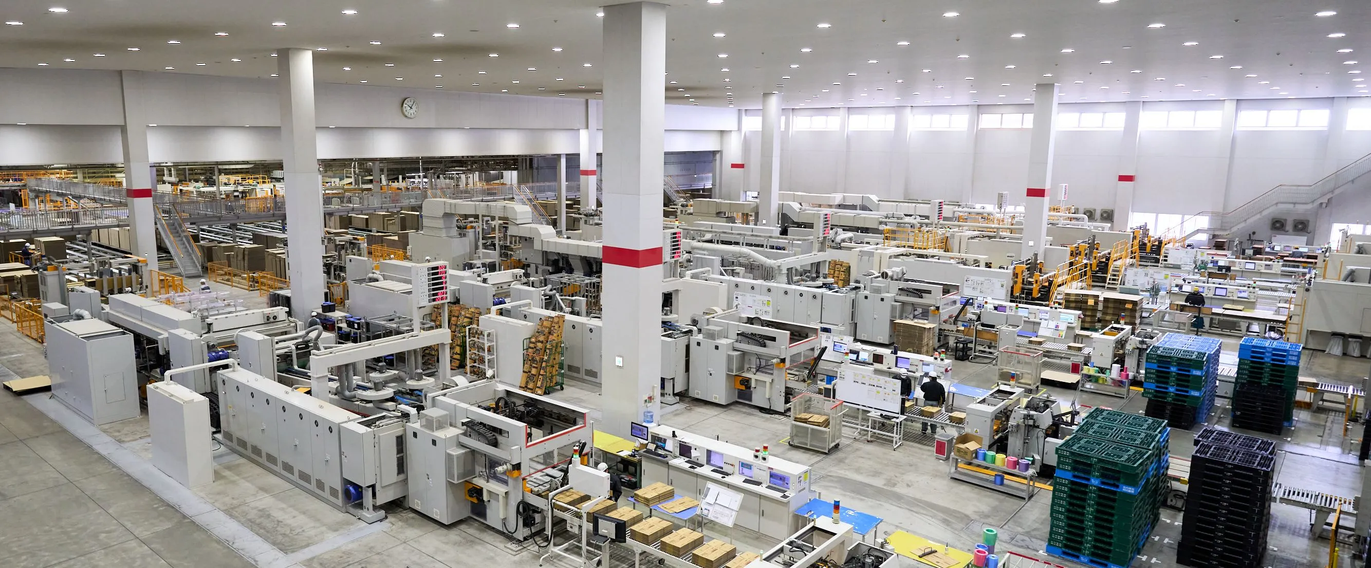 段ボール箱は寸法や形状、紙の種類、材質構成、印刷などすべてがオーダーメイドで、多品種・小ロットから数万箱規模の大量生産まで幅広く求められる製品です。そのため生産現場には、迅速な作り分けを可能にする対応力や、瞬時にオーダーチェンジできる機動力、大ロットを効率的につくる高い生産性が必要です。
