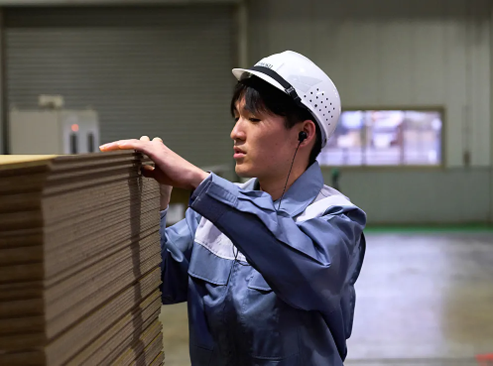 現在は TM450 という貼合機でカッターマンを担当しています。カッターマンは、お客様の求める規格どおりに段ボールを仕上げる重要な役割です。サイズだけでなく、反り具合や厚み、仕上がり精度など細かな基準を満たすため、機械や紙の状態を見ながら常に微調整を行います。日々状況が変わる難しさはありますが、自分の手で品質をつくり上げている実感があり、とてもやりがいを感じています。